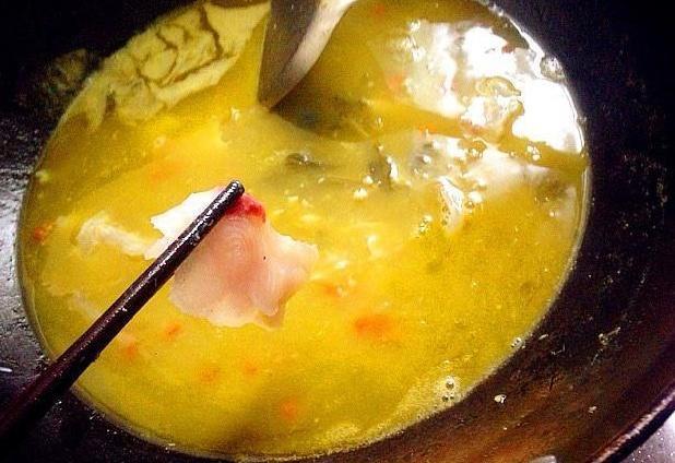 将煮好的鱼片儿悄悄的倒入铺好酸菜的碗底,鱼汤也一同倒入