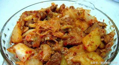 ①准备原料,辣白菜切小片,肉切片,土豆切片(不要太薄阿)。
