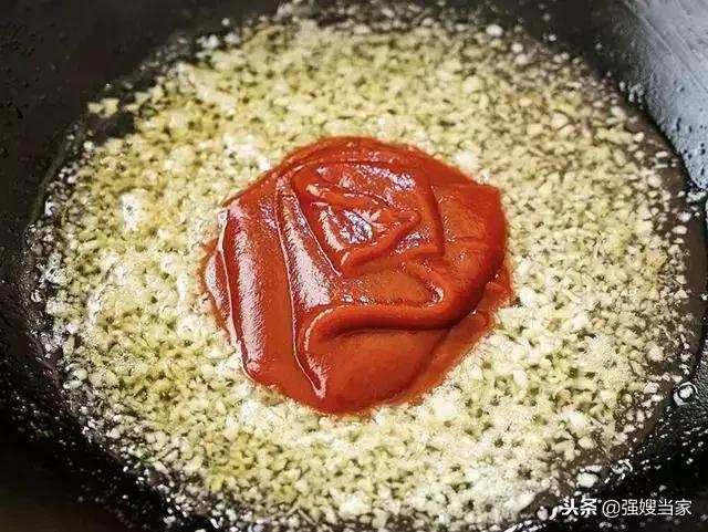 2,锅中留底油,放入姜蒜末爆香,放番茄汁翻炒出红油。
