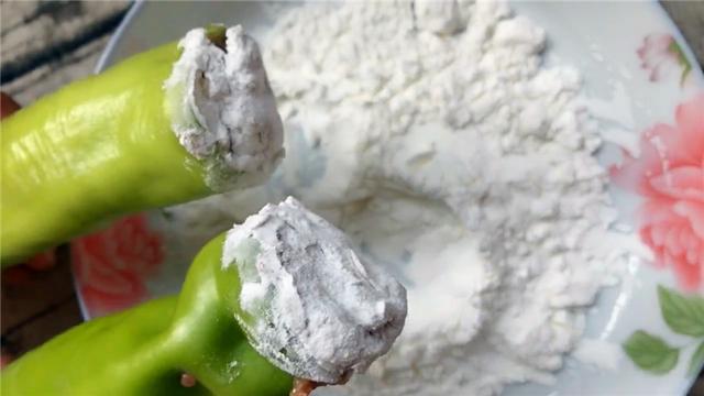 5、准备一个装有玉米淀粉的碗,把塞好肉馅的青椒,一头沾满玉米淀粉,如图所示。这样做的目的是让炸的肉馅不会散。