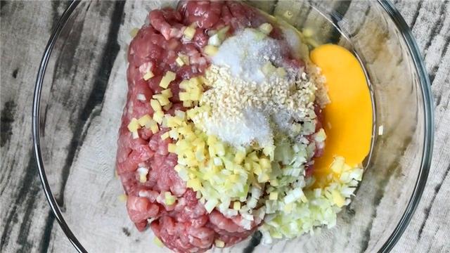 2、现在我们来调肉馅,准备剁好的猪肉馅放到碗里面,加入葱、姜末,打入一个母鸡蛋,加入适量的盐、鸡精、味精、少许清水,用筷子搅拌均匀。