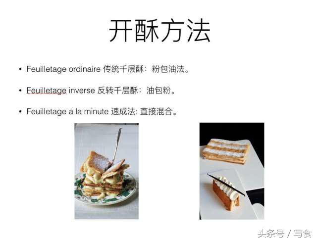 传统千层酥的粉包油法就是有一个面团,一个黄油,用面团把黄油包裹进去,然后进行六次的翻折,折完之后一层黄油一层面粉,这样组成的千层酥。特点是口感比较有嚼头,吃法是将千层酥放倒,用叉子从上往下的切,这样它的酱汁就不会从侧边流出来。