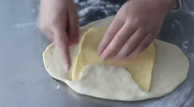第1步,将盐加入水中融化。高粉低粉混合过筛后与室温软化好的黄油揉搓混合,成酥粒状后加入盐水,揉成面团,在案板上反复揉搓,直到面团表面光滑。用刀在面团上切开一个十字开口,开口的深度大概是面团整体厚度的三分之一,保持开口的状态,用保鲜膜包裹住,进冰箱冷藏一个小时。