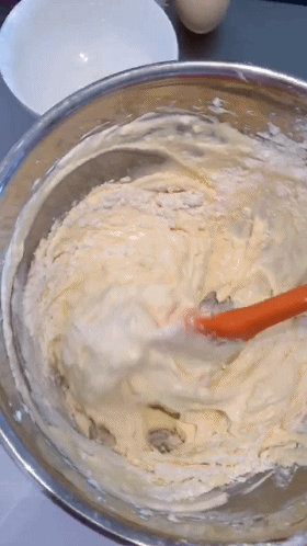 第4步,加入液化的黄油,拌匀。搅拌手法也是“J”字型翻拌。