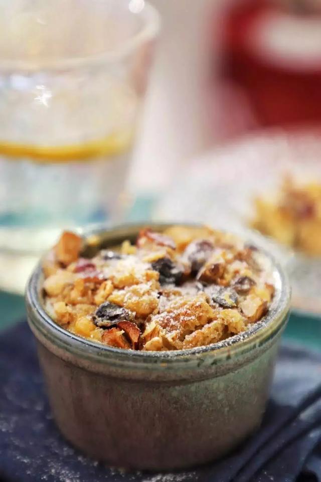 3. 撒上果干果脯等按压浸入蛋液,放入烤箱烤25分钟左右至表面金黄即可。