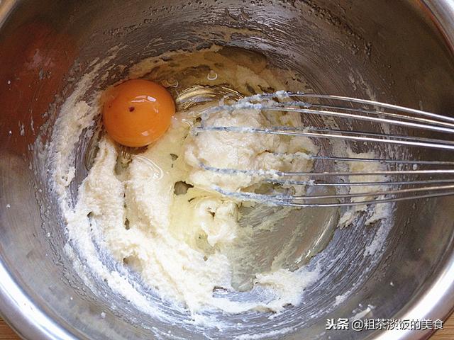2、黄油软化后,分次放入细砂糖搅拌至顺滑,再打入鸡蛋