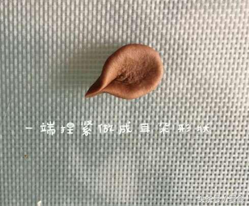 做耳朵拿一部分咖啡色面团分成2.5克左右的小面团,擀成椭圆形,一端捏紧做成耳朵形状,做好所有盖上保鲜膜放置一边备用。