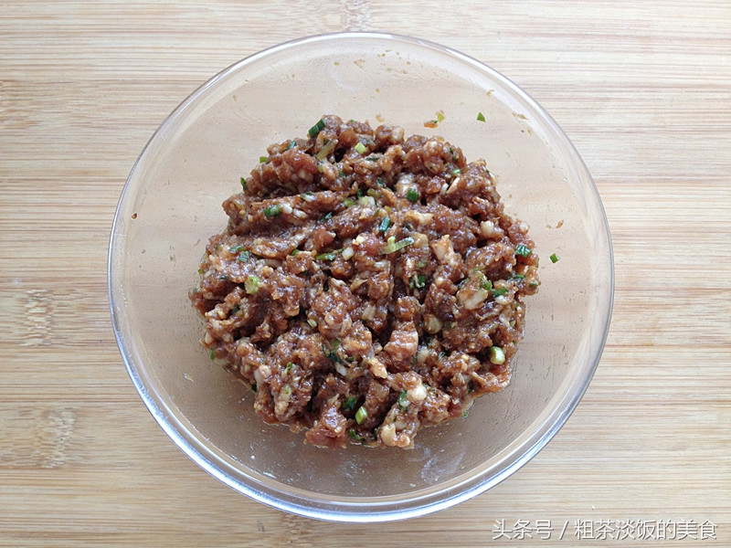 1、先来调肉馅:肉末中放入葱花、姜末、盐、生抽、白胡椒粉、糖、鸡精,顺一个方向搅拌均匀备用
