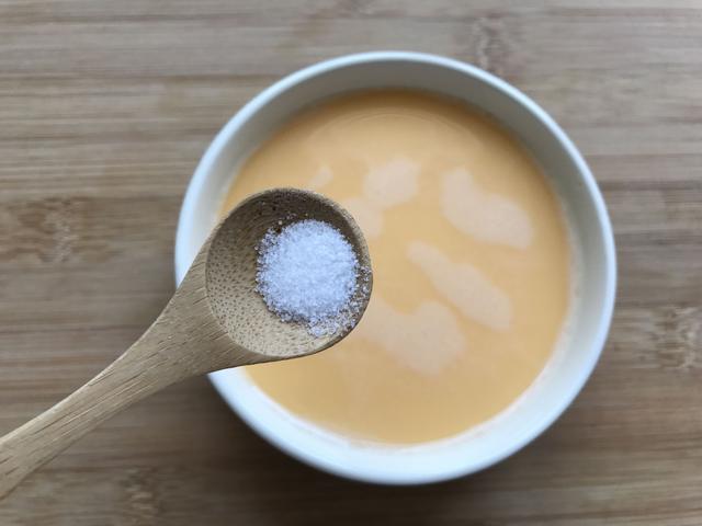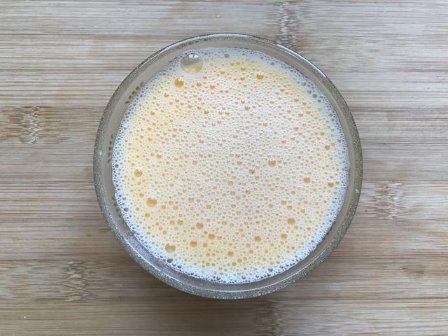3、鸡蛋打散后加入清水,鸡蛋液和水的比列是1:1.5