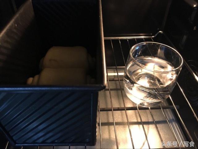 第三步,将三个卷放入吐司盒中,在烤箱中放入一杯水,将其放入烤箱发酵至九成发。预热烤箱到180度。