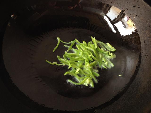 9、锅中倒入少许油,将油烧热,放入青椒丝快速翻炒几秒关火盛出