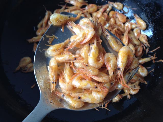 7、炒到小虾没啥水分开始变脆时,就得转中小火