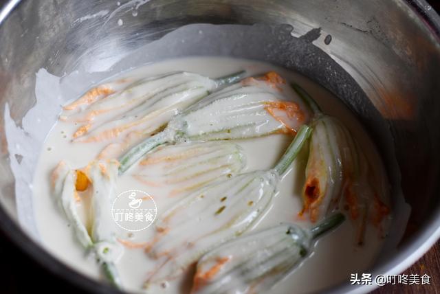 把南瓜花分次浸入面糊中,让每个花朵都能沾满面糊。小编这面糊调的稀了一点,所以面糊挂得比较少,大家自己做的时候可以再调浓稠一点。
