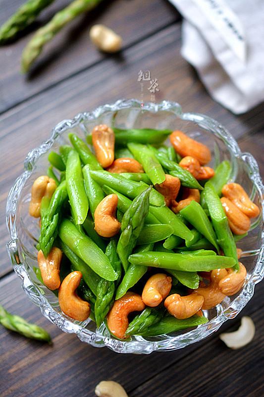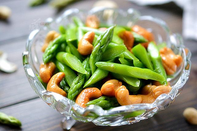 食材:芦笋 200克,腰果 50克,油 适量,盐 1克、味极鲜酱油 5克,白醋 5克,糖 8克,芝麻油 3克