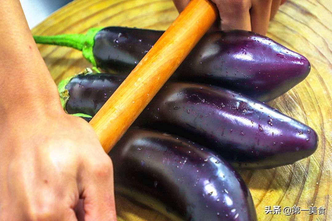 1.首先,我们准备紫茄子三个,用面杖擀一下,把茄子内部的纹理擀松、擀出汁水,这样更容易入味。