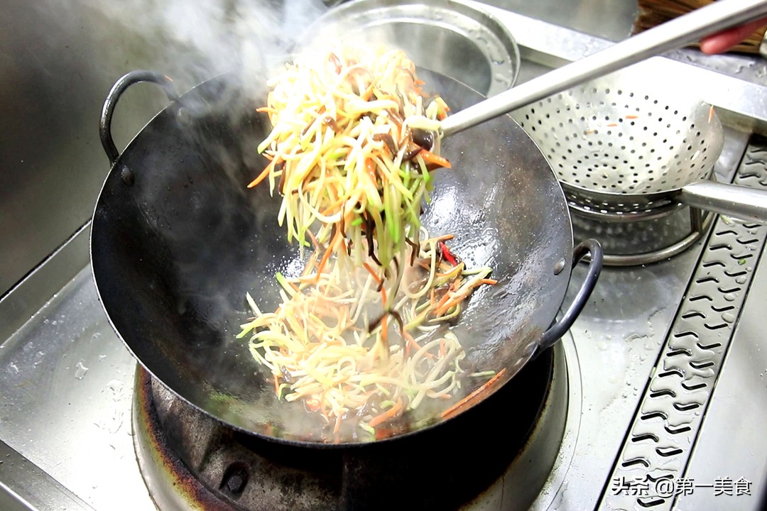 5.锅内烧水,加入一些食盐和鸡粉入底味,倒一点植物油和白醋,防止配菜中的营养成分流失,保持配菜鲜亮的色泽。水烧开以后把蔬菜丝放入锅中,焯水1分钟左右,配菜断生以后倒出来,快速过一下凉水,以免回软、吃着不够清脆。
