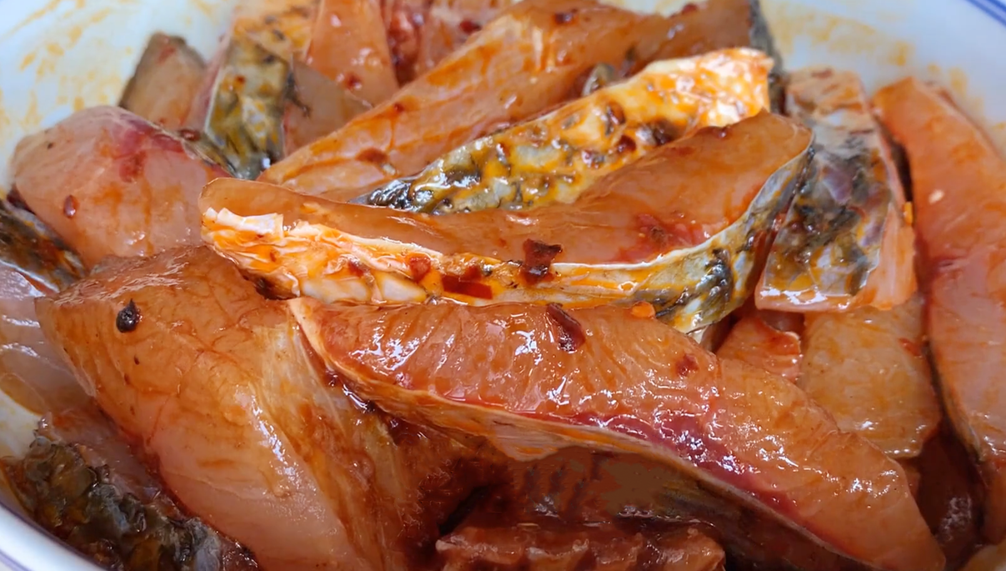 1.将所有的食材都准备好,买回家的鱼先清洗干净,然后用骨剪把鱼鳍剪掉,再在鱼头和鱼尾处都各切一刀,把里面的鱼腥线拔出来,这样能够很好地减少鱼腥味。拔的时候一边拔,一边用手拍打鱼身,这样拔的时候不易断在里面。把鱼肉先整块切下来,然后把鱼头切下来放一边,炖汤。鱼骨切成块,放入盆里。再把鱼肉切成大小适中的块,也装入盆里。现在开始来腌制鱼肉,放入2勺盐,2勺生抽,半勺老抽上色,1勺料酒去腥,少许胡椒粉,适量的食用油,再来一勺自制辣椒油,然后用手抓拌均匀,让鱼肉均匀吸收进料汁的味道。放辣椒油的时候,如果喜欢吃辣,可以多舀点辣椒进来,如果怕辣,就少点辣椒,多放点辣椒油。抓拌均匀后,放在一旁,腌制10分钟,让鱼肉入味。
