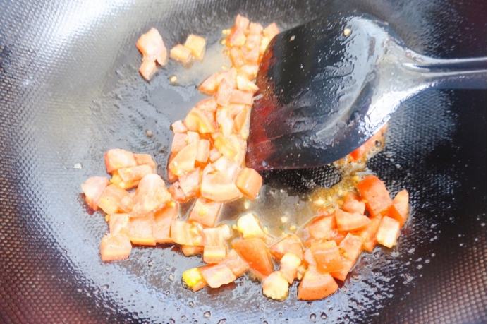 5. 把炒鸡蛋剩余的油给加热,可以把番茄丁先倒入锅中翻炒,翻炒时用铲背按压西红柿,让西红柿能炒出汤汁。