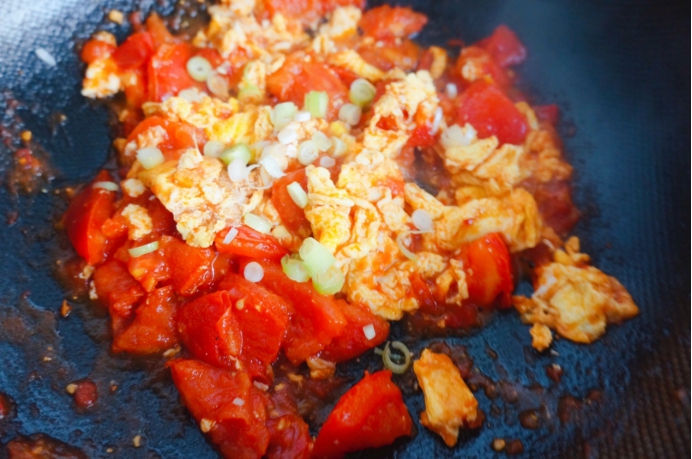 9. 西红柿炒鸡蛋出锅前,稍微切点葱花倒入锅中,这样能起到调色的效果,还能让西红柿炒鸡蛋这道菜味变得更好。