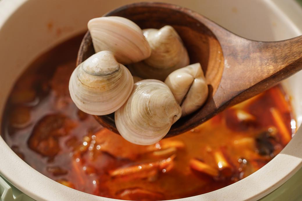 6. 等电饭锅结束工作之后,打开电饭锅再次按下煮饭键,等锅里面的汤再次沸腾之后把煎过的虾和蛤蜊放入锅中就可以了。