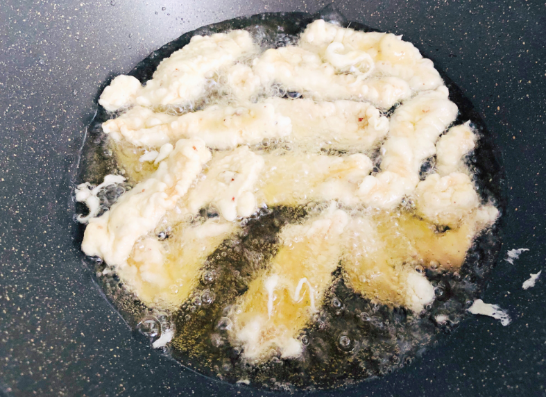 ⑵调制面糊时,要用淀粉,不要用面粉。红薯淀粉的粘性、吸水性,都要高于面粉,炸出来的口感更酥脆,放凉后也不回软、不发硬。用面粉,放凉后就容易发硬。