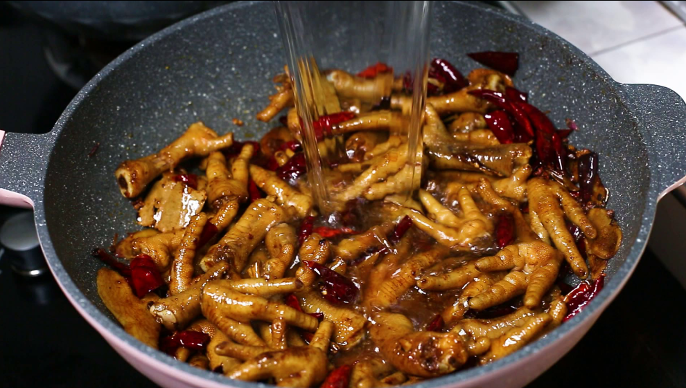 最后把鸡脚倒在锅中,这个鸡脚必须要记得先用冷水焯一下水,煮出当中的血液,调味只需要放入盐、蚝油、生抽,老抽,可以加少许的火锅底料,把鸡爪在锅中炒成酱红色,然后再加入纯净水。