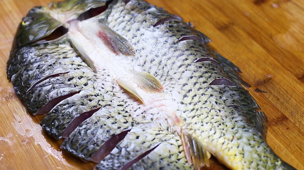 首先准备一条鲤鱼大概两斤重,从背上破开,取出内脏,在鱼肉的两侧打上花刀,更方便入味。