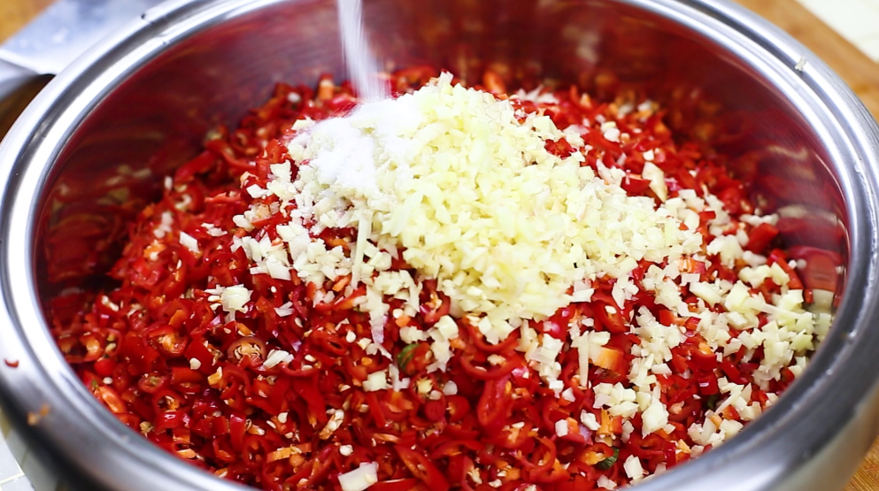 剁多辣椒最重要的就是盐,一定要多加一点,因为盐可以防止辣椒变坏。