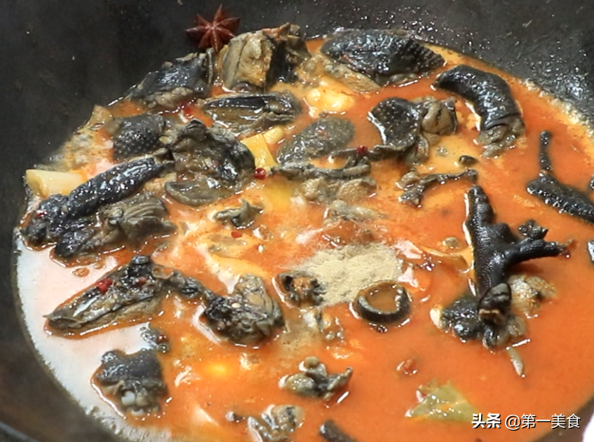 然后加入适量清水没过鸡块,加入食盐3克、胡椒粉2克、 再放入两块冰糖增鲜。
