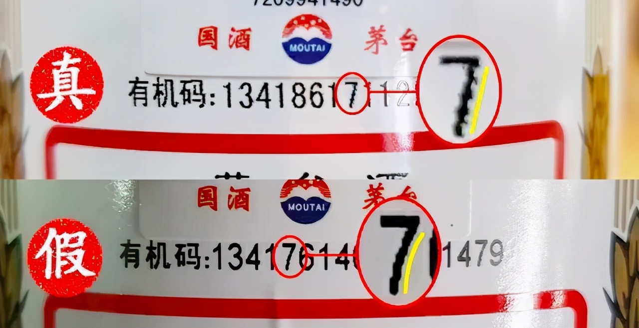 茅台从2009年初开始在背标上方使用物流吗,当时采用的7是弯的,10年以后开始使用直7,但是具体的启用时间有待考证,这么说的话大肚7在物流码中存在时间为1年甚至更久,所以2009年,2010年的茅台中见到大肚7是正常现象,而有机码是在12年7月才开始启用的,是在直7启用之后,所以有机码中有大肚7,通常就是假酒了。