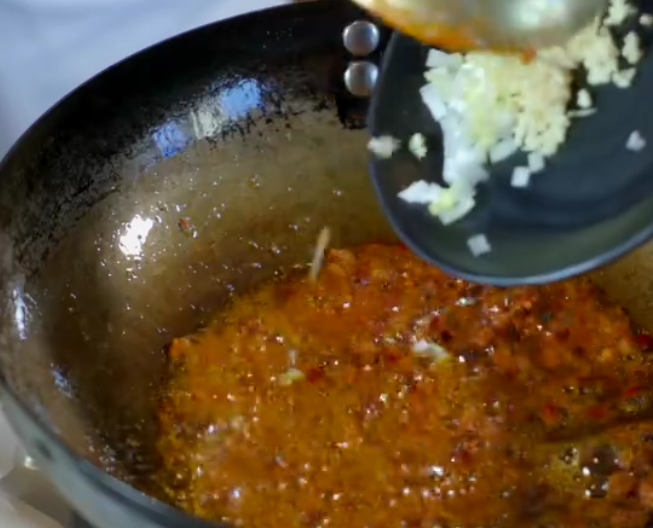 5、豆瓣酱煸出香味后,我们下入葱花、姜末、蒜末、加入花椒面少许,再用小火炒一下。