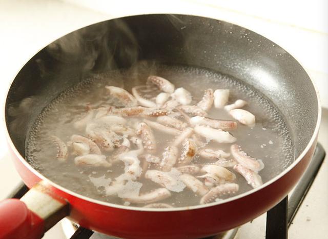 2 、锅中适量清水烧开,放入料酒,倒入鱿鱼段焯水后捞出沥水备用。