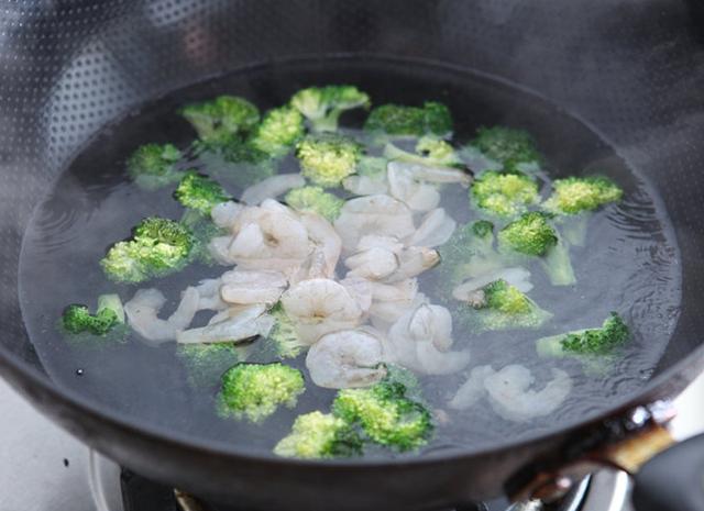 3、西蓝花和虾仁一起放入锅中焯水,捞出沥干。(焯水的时候可以少加点盐)