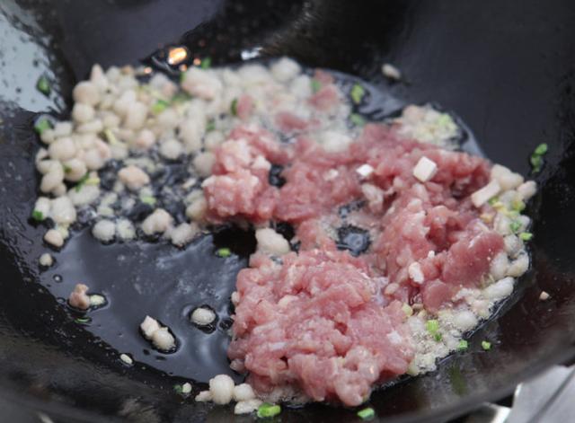 4、油锅7分热,倒入香葱爆香,再转小火煸炒肥肉,多炒一会儿直至把肥油都煸出来。