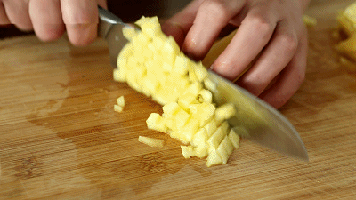 2、把挖出的菠萝肉切成小丁,装盘备用。