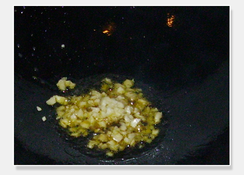 步骤4:锅中留少许底油,倒入蒜末5克,小火煸炒出香味。