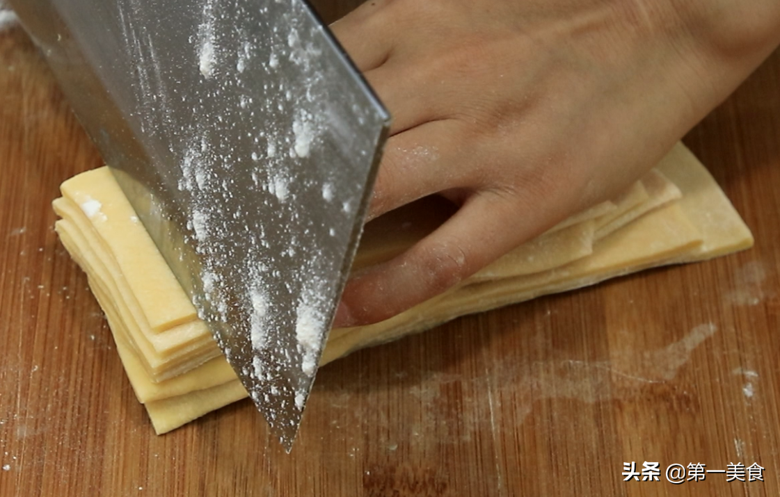 撒上一层面粉后把宽条摞起来,然后切成1厘米左右的窄条。