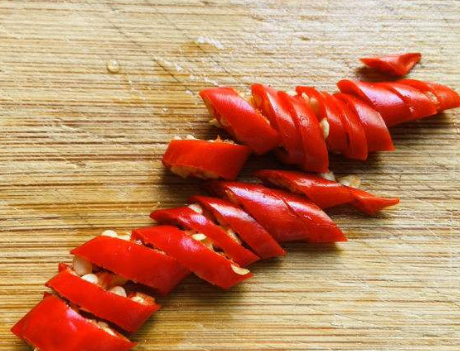 第二步,小米辣去掉根蒂,切成圈,准备一个小碗,放入生抽、老抽和米醋,再加上半勺白糖和少许的食盐,混合搅拌均匀成料汁;