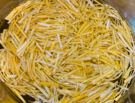 第三步,切了四刀,便可轻松将果肉取出来,剥下的柚子皮用刨丝的工具刮下来,薄薄的一层黄皮便可,柚子皮用盐水浸泡1个小时,挤干水,连同水、冰糖下入锅中;