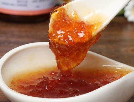 第五步,一边煮一边搅拌,熬至个人喜欢的程度后,便可关火,让其放凉后,根据个人的口味加上点蜂蜜,搅拌均匀,装入瓶中,放冰箱保存便可。