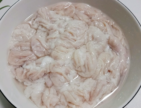 第二步,然后在其中加上清水,浸泡一会,接着再将大肠翻面,内层的油脂用手撕掉,再次浸泡10分钟,换下水,在其中加上新的面粉和小苏打;