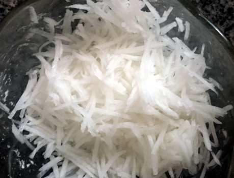 制作过程:第一步,萝卜一根,将其清洗干净后,削去皮,将萝卜擦成细细的丝,不用剁,直接放入一个大碗中,加上一勺食盐,用筷子搅拌好;