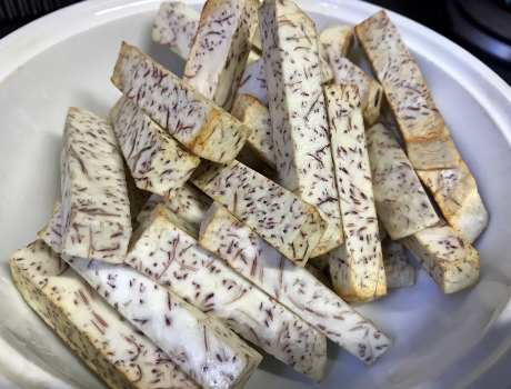制作过程:第一步,紫色芋头准备出适量,将其分别削去皮后,仔细清洗干净,将芋头切成与手指一般粗细的条状;