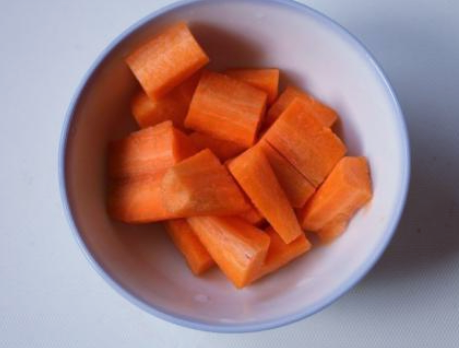 第四步,这个过程中胡萝卜洗净,一边滚动一边切成块,待羊肉差不多炖了半个小时的时间,将胡萝卜块放入在锅中,同时加上点酱油和食盐调味;
