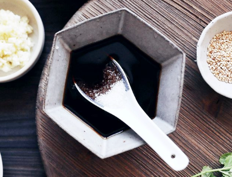 第四步,过程中,准备一个小碗,放入生抽、醋、食盐、芝麻油、藤椒油、辣椒油和少许的香菜梗,放入一勺煮开的汤水;