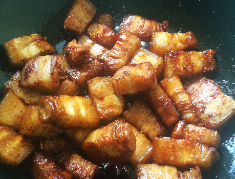 第三步,直到将五花肉每一面都煎黄,先盛出,用煎出的肥油放入冰糖,小火将其炒化,慢慢炒至焦糖色的时候,先关火;