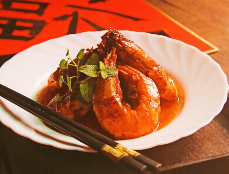 第五步,同时将炸好的大虾一同放入在锅中,快速翻拌均匀,使得大虾上能均匀粘裹料汁,然后再家还是那个少许的料酒,焖烧一会,根据个人的口味加盐调味出锅。