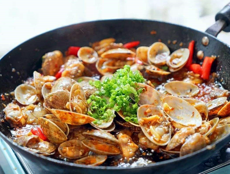 2、炒花蛤的时候,多放点葱姜蒜,一方面可以提升口感,另一方面还可帮助去除其中的异味,喜欢吃辣的便可多放点干红辣椒,当然了吃不了太辣便可不用放辣椒,用豆瓣酱中的辣味便足够了;