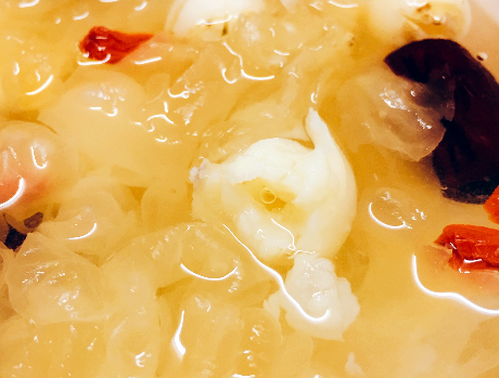 3、食材记得要分次来煮,不要一下子将所有的都放入在锅中,煮汤的过程中,银耳出胶质后便容易会扑锅,所以建议去掉锅盖,冰糖可以根据个人喜欢的甜度来定,出锅前放入便可以了。