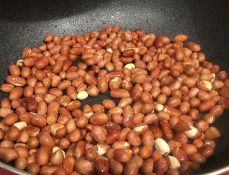 制作过程:第一步,事先在锅中加入平常炒菜用的油量,将油烧热后,关火,冷却至凉,这个过程中花生米准备准备出适量,将其简单淘洗下;